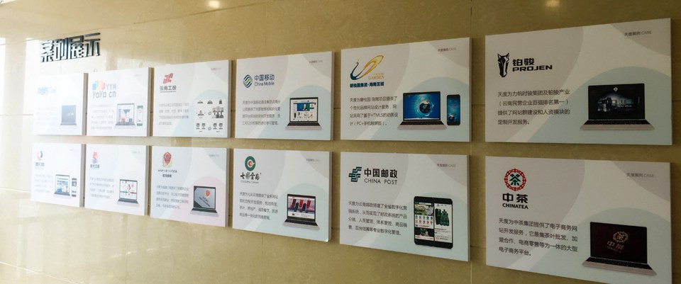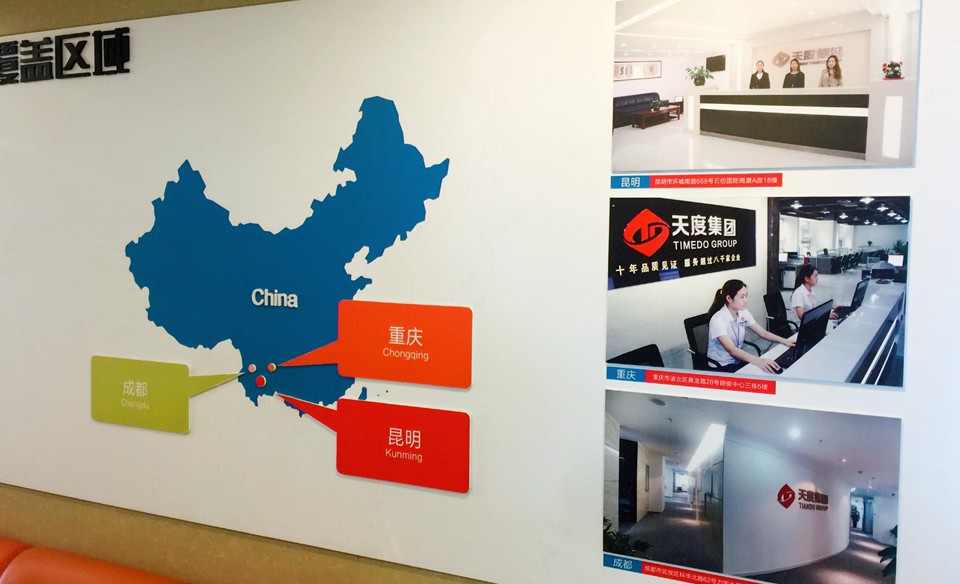 再往里走就到了“覆盖区域”文化墙,主要内容是展示重庆、昆明、成都三个总部地址。