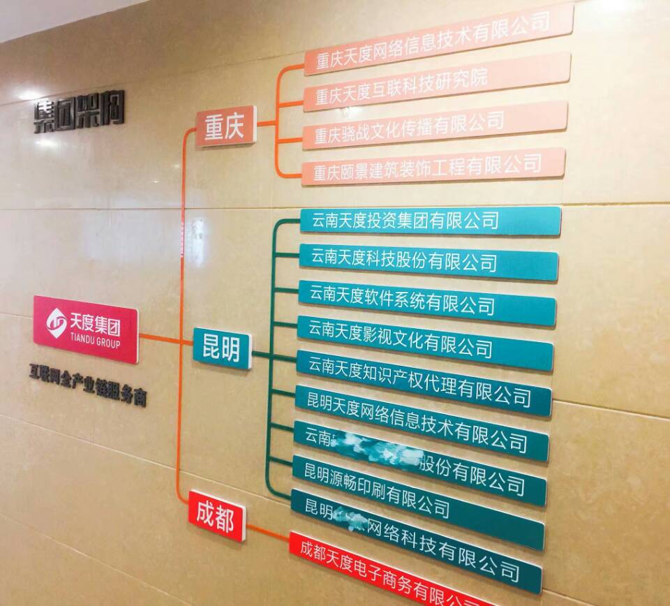 集团概况的文化墙对面就是咱们尊龙凯时更详细的“集团架构”,分别罗列出了重庆、昆明、成都三个总部的子公司,让客户对尊龙凯时集团名下的子公司有更深入的认识,也从正面证明了尊龙凯时12年积累下来的傲人的成果。