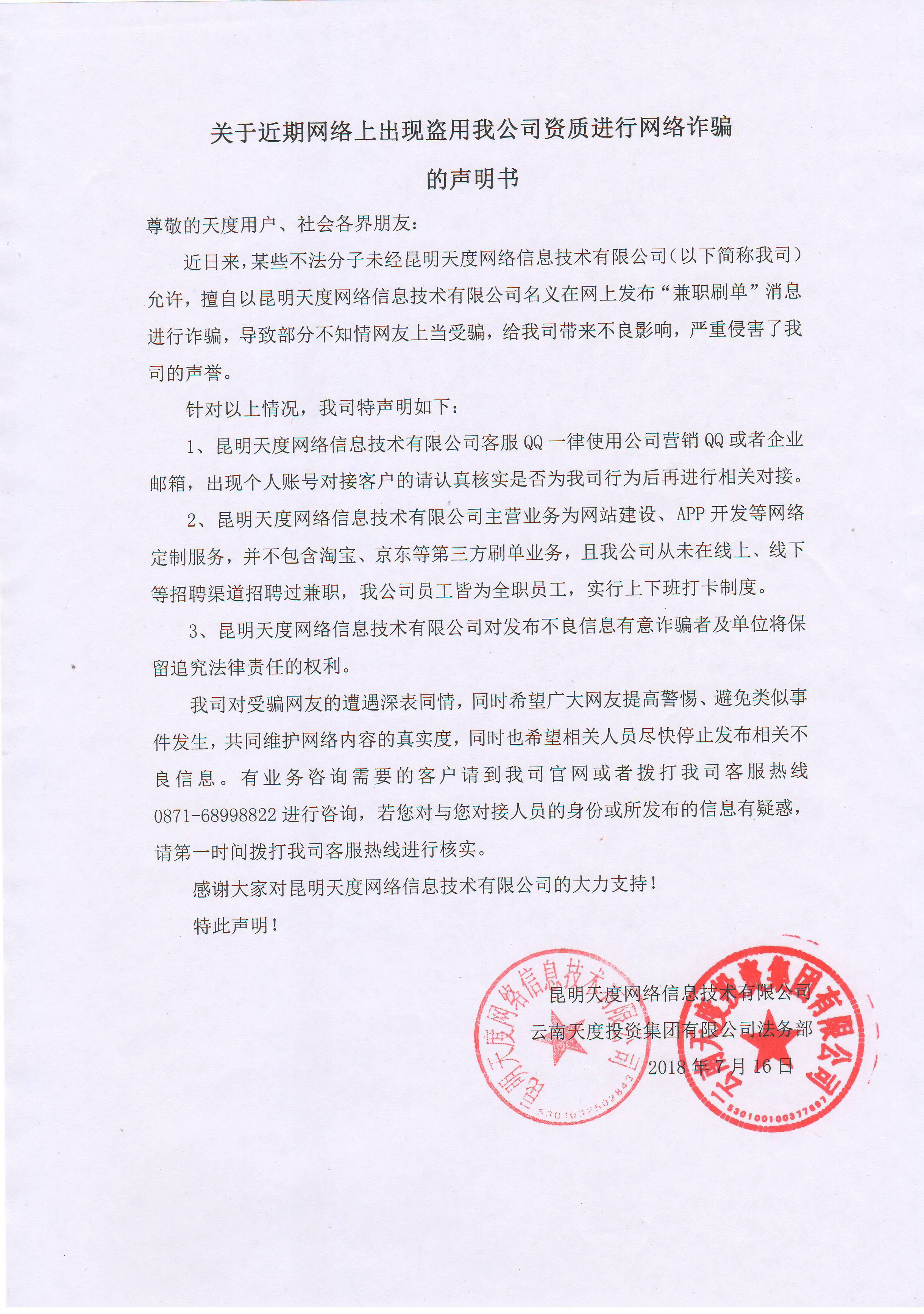 关于网络上盗用我公司资质进行网络诈骗的声明